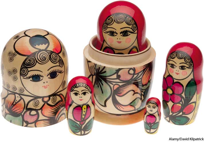 n. A nesting doll that is part of a set and is decorated with the features of a woman in traditional Russian dress. [Russian matrëška, from diminutive of Matrëna, feminine personal name (associated in popular tradition with the mothers of large peasant families), from earlier Matrona, ultimately from Latin mātrōna, matron; see MATRON.] ![]() (click for a larger image) matryoshka |