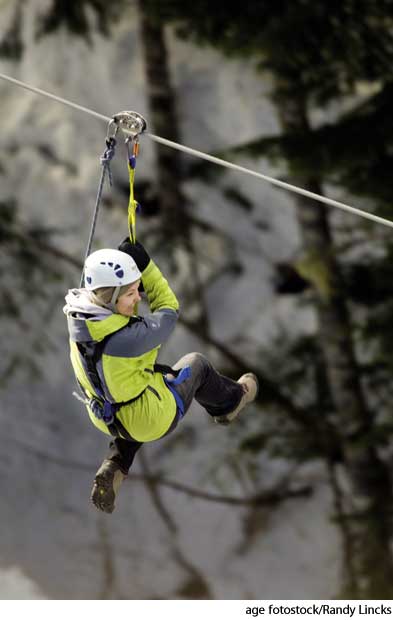 A transportation system or piece of recreation equipment consisting of a cable stretched between points of different elevations, a pulley, and a harness or bar for attaching a rider, who moves by gravity.
