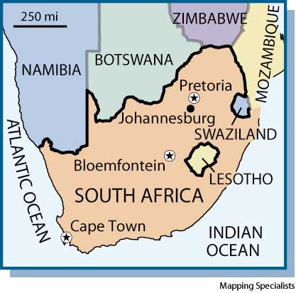 Tweet A country of southern Africa on the Atlantic and Indian Oceans. Originally inhabited by the San and Khoikhoi, the region was settled by various Bantu peoples c. 1500. European settlement began with the Dutch in the mid-1600s. The region passed to Great Britain in 1814 but was hotly contested by descendants of the Dutch settlers in the Boer War (1899-1902), in which Britain took possession of the entire territory, creating the Union of South Africa in 1910. South Africa declared itself a republic in 1961, severed ties with the British Commonwealth, and further consolidated the apartheid system, which was repealed beginning in 1989. An interim constitution ending white rule was adopted in 1993, and the first multiracial elections were held in 1994. Pretoria is the administrative capital; Cape Town, the legislative capital; and Bloemfontein, the judicial capital. Johannesburg is the largest city. South African adj. & n. ![]() (click for a larger image) South Africa |