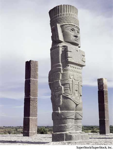 [Spanish tolteca, from Nahuatl toltecatl, artisan, mechanic.]  (click for a larger image) Tolteccarved basalt column of a warrior atop the Temple of Quetzalcoatl Teotihuacán, Mexico |