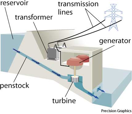 Tweet adj. 1. Generating electricity by conversion of the energy of running water. 2. Of, relating to, or using electricity so generated. hy′dro·e·lectri·cal·lyadv. hy′dro·e·lec·trici·ty(-i-lĕk-trisi-te)n. ![]() (click for a larger image) hydroelectricThe mechanical energy of moving water is transferred by a rotating turbine to a generator, where it is converted to electric energy and conveyed along transmission lines. |