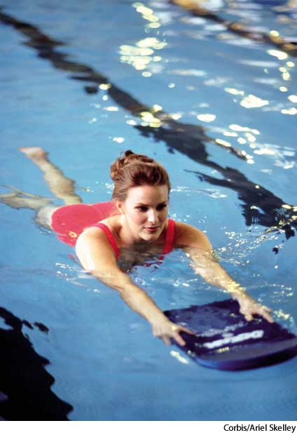 n.1. A buoyant board used to keep the upper body of a swimmer afloat while allowing free movement of the legs, used chiefly to improve kicking technique or develop leg strength and endurance.