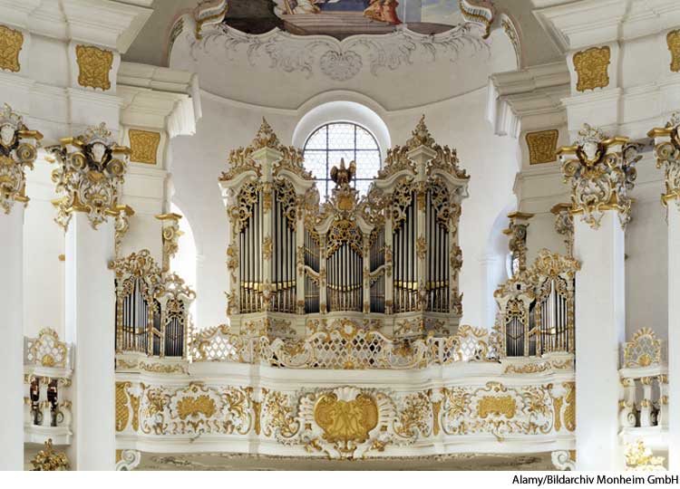[French, probably alteration of rocaille, rockwork, from roc, rock, variant of roche, from Vulgar Latin *rocca.]  (click for a larger image) rococo1757 organ in the loft of Wies Church near Steingaden, Germany |